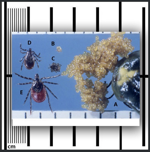 Mint minden ízeltlábú esetében, a ciklus egyes szakaszait itt is vedlés határolja. A petéből (Lásd a fotón: 2-es kép "A"), lárva kel ki (Lásd a fotón: 2-es kép "B"), melynek még csak 6 lába van, és nem szaporodik. Több lárvastádium után nimfa-stadiumok (Lásd a fotón 2-es kép "C"), következnek, a nimfáknak 8 lábuk van, és nem szaporodnak. A kifejlett állat (Lásd a fotón: 2-es kép "D" és "E"), vagy más néven imágó szintén 8 lábú, ivarosan szaporodik: párzás után petéket rak.